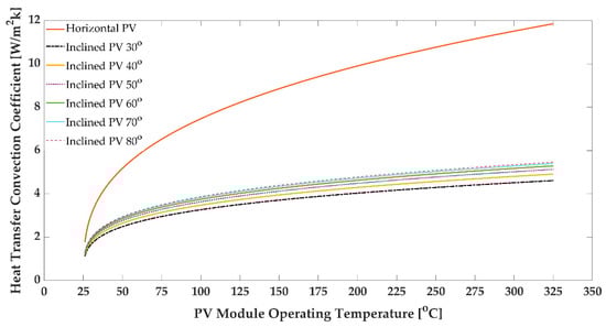 Figure 5 represents the convection heat transfer coefficient, h, for a PV panel with various operating temperatures. Based on the relationship obtained in Equations (12) and (13) for flat and inclined panels, this figure shows that the flat PV module convection coefficient is more extensive than all inclined PV modules with any tilt angle in this study.