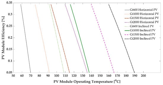 PV modules with a higher Gt have better efficiency. In the literature, efficiency is a function of the PV module operating temperature and solar flux [3,31]. Nevertheless, there is no significant investigation of efficiency and solar flux correlations [31]. Figure 6 dictates an analogous flat PV panel with different solar flux, and each curve has a unique efficiency compared to the corresponding inclined PV module with similar solar flux.
