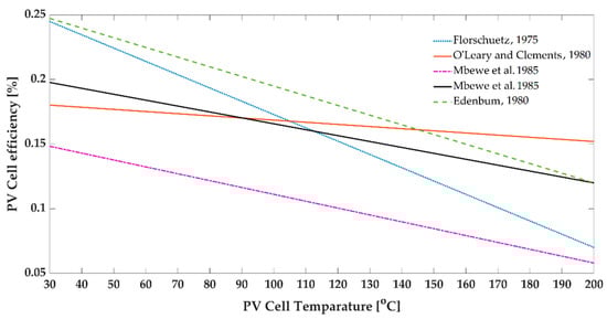 Figure 7 presents the empirical model from the literature that mentioned the linear relation between the PV cell efficiency and operating temperature. All suggested models specify unique PV cell properties and working conditions. As evident in Figure 7, there were no similarities between the models because the models did not cover all the effective parameters from the environment and PV cell setup [67].