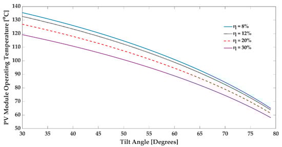 Figure 8 shows the operating temperature change vs. the tilt angle for an inclined PV module with a specified efficiency: solar flux is Gt = 1000 W/m2 at . This shows that an increasing tilt angle leads to a colder PV module, resulting in less energy gain. For all efficiency curves, a tilt angle of has the best efficiency at this setup. This figure illustrates that a hotter operating temperature causes less efficiency.