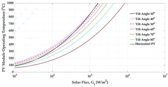 The results in Figure 9 represent the PV module temperature variation vs. the solar flux gained. It is well known that when a PV module receives intensive solar fluxes, the operating temperature increases. This figure shows that the flat PV module has a smaller increase in temperature than the inclined PV module. On the other hand, between the diagonal PV panels with various tilt angles, a PV panel with a tilt angle of has a sharper increase in temperature than different tilt angles. In the literature, for solar fluxes perpendicular to a flat PV module, the optimum tilt angle ranges between and [2,26,27,28,29], which matches this at a hotter temperature. Hence, there is a higher absorbed energy.