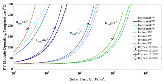 PV module operating temperature vs. solar flux with , horizontal PV module and an inclined PV module at , without a cooling system.
