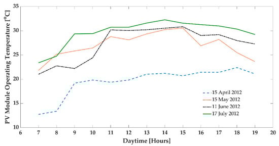 Solar ray direction, which changes during daytime and causes a direct effect on the PV module temperature, is considered in the equation. The daytime changing pattern for PV module temperature via the equation significantly matches the recorded site data concerning the daytime hours shown in Figure 11, Figure 12 and Figure 13.