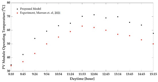 PV module operating temperature vs. daytime hours from 8:10 a.m. to 3:15 p.m. The filled red color circle curve is experimentally recorded data from [67]. The filled black color square curve has been calculated based on the input from [67] to compare the proposed model and empirical result.