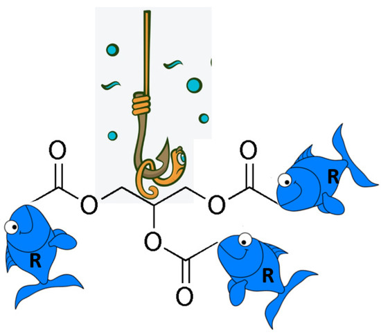 Group additivity (GA) methods are also a type of structure–property relationships [37,38]. The enthalpies of vaporisation of a set of molecules with reliable data are usually split up into the smallest possible groups, like “LEGO®” building blocks. Using the matrix calculations, each group obtains a well-defined numerical contribution. The prediction of the vaporisation enthalpy is then a construction of the molecule from the building blocks, collecting the energetics of a molecule from the appropriate number and type of bricks. In general, using this method for large molecules is impractical due to too many building blocks. To overcome this disadvantage, we develop a general approach to estimate vaporisation enthalpies based on a so-called “centerpiece” molecule [39,40]. The idea of the “centerpiece” approach is to start the prediction with a potentially large “core” molecule that can generally mimic the structure of the molecule of interest, but at the same time must have a reliable vaporisation enthalpy. The triglycerides are predestined for such an approach. The visualisation of the “centerpiece” approach for triglycerides is given in Figure 2.