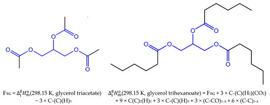 Using the group additivity contributions given in Table 7, the predicted Δ l g H m o (298.15 K)-values for triglycerides under study were calculated and the results are given in Table 2, Table 8 and Table S7).