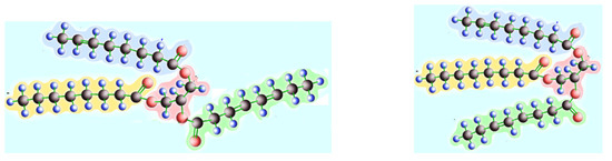 As a matter of fact, the GA methods are not only a suitable tool to predict molecular energetics, but also a tool to detect unusual energetic effects. When the experimental and additive results show significant discrepancies, it is best to look for specific interactions causing the deviation from additivity (assuming the experimental result is reliable). In the case of triglycerides, we validated the experimental vaporisation enthalpies with different structure–property correlations. In what follows, the profound deviation from additivity observed in Section 3.5 should only be caused by overlooked interactions specific to these long-chained molecules. Basically, the standard molar vaporisation enthalpy, Δ l g H m o , is the portion of energy (enthalpy) required to transfer 1 mole of the liquid compound to a gaseous state. Thus, the vaporisation enthalpy can be taken as a measure of the overall attractive forces between the molecules in the liquid state. If these attractive interactions are responsible for significant interlinking of alkyl chains in the liquid phase, the energy required to take out the triglyceride with the interlocked chains from the liquid to the gas phase should be higher and the corresponding enthalpy of vaporisation greater in comparison to the additive value. Therefore, the relative decrease in the experimental vaporisation enthalpy can only be explained by assuming that the attractive forces are partially entrained into the gas phase. In this case, the attractive dispersion interactions between chains in the gas phase could be a plausible explanation for the deviation from additivity, since these specific non-covalent dispersion interactions are not considered in the GA parameterization. The existence of such dispersion-stabilized conformers in the gas phase has been theoretically supported by quantum chemical calculations [42]. Structural optimization of the long-chain triglycerides with MOPAC-PM7 showed that the most stable forms are folded conformers with three parallel chains that interact [43]. Similar to linear alkanes, folded configurations are favoured over extended star conformers [44,45]. Two possible structures of dispersion-stabilized conformers are shown in Figure 4, where the attraction of alkyl chains in the gas phase due to dispersion forces is evident.
