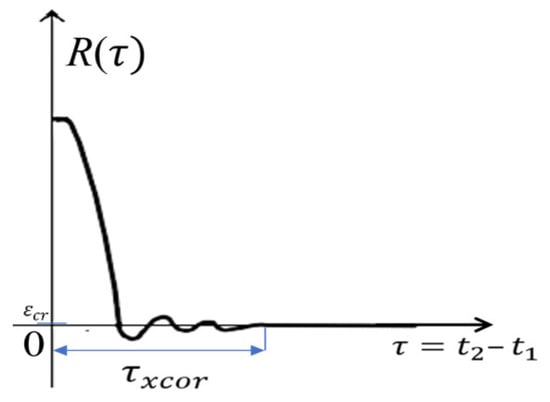 To do this, it is necessary to make two representative samples from this process: xk1 (into section t1) and xk2 (into section t2) (see Figure 1), at a distance between sections  (where  is an estimate of the autocorrelation interval), at which Pearson’s autocorrelation coefficient  is less than some critical parameter  steadily tending to zero () (see Figure 2):