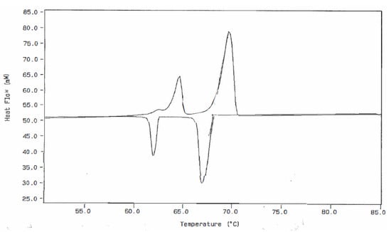 DSC Thermal Curve for a 3.050 Milligram Sample of n-Dotriacontane at a Heating Rate of 5.0 °C/min (Upper) Followed by a Dynamic Cooling Rate of 3.0 °C/min (Lower).