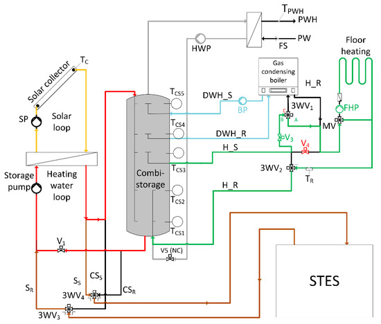 Schematic of the considered system. Different colors denote the various loops of the system at different temperature levels: Solar loop (Orange), STES charging (Brown), Solar charging of the Combi-storage tank (Red), Space Heating (Green), DHW (Grey), and Boiler charging the CST for DHW (Light Blue).