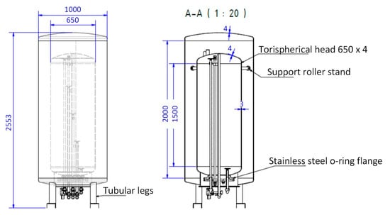 The combi-storage water tank is thermally stratified and works as temporary thermal energy storage in the form of hot water. The combi-storage tank capacity is equal to 535 L, with its main external dimensions shown in Figure 4. For the thermal stratification to be preserved while at the same time minimizing heat losses, the tank needs to be highly insulated. This is achieved by a vacuum-wall-insulated tank. This way, the thermal losses via conduction and convection are minimized due to the absence of air, and the radiant losses are predominant.