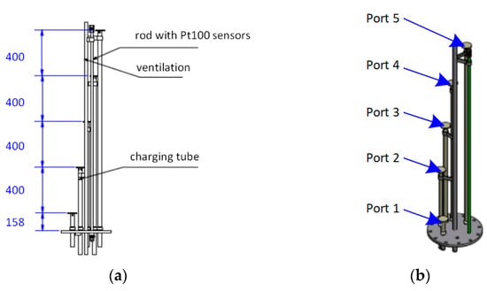 The tank is double-walled; between the inner and outer walls, high-efficiency non-removable vacuum insulation is included, making the buffer tank suitable to operate in outdoor conditions. The tank is supported by metal feet, while flanges extend from the bottom, allowing access to all five different ports. The insulation space is filled with thermal radiation absorber material. The absolute pressure is <<100 Pa, preventing aging effects on the insulation value. The pressure can rise slightly in 5/10 years due to the long-term diffusion effects. A pressure higher than 1000 Pa could lead to higher thermal losses. The technical data of the combi-storage tank are summarized in Table 1. There are five available ports, numbered as shown in the schematic of Figure 2, all entering vertically from the bottom of the tank to different heights of its interior, with the corresponding dimensions of Figure 5. At the same height as each port, there is a Pt100 thermal resistance sensor to ensure accurate measurement of the temperature in each subcircuit of the system.