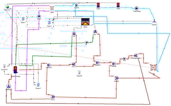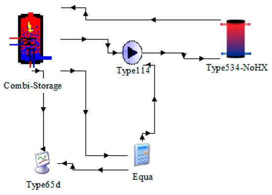 The DHW profile was modeled based on the Type 14 “forcing function water draw.” In order to ensure a step function in TRNSYS, independently of the time step, two Type 14 components were used and added in an equation to create the complete DHW demand profile. The three-way mixing valves used in the system were modeled with the Type 11d component, while the three-way diverting flow valve was modeled with Type 11f. Finally, all pumps were modeled using Type 114 single-speed pumps. An overview of the global system’s setup in TRNSYS 17 is shown in Figure 6.