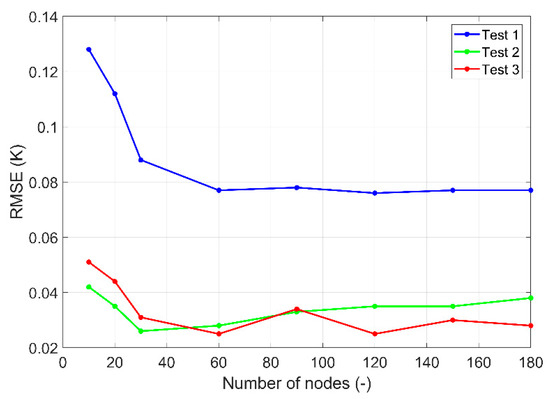 Eight different simulation cases with a number of nodes equal to 10, 20, 30, 60, 90, 120, 150, and 180 nodes, respectively, were compared to three different charging experiments. The Root Mean Square Error (RMSE) was estimated, as shown in Equation (1), by comparing each temperature simulation result for the five different ports at the time the test’s completion setpoint is reached with the experimental results for all three experiments. The RMSE results for each number of nodes tested and for the three tests are presented in Figure 8. As can be observed, for a number of nodes higher than 60, the improvement is relatively small. In fact, this comes in agreement with the study by Wischhusen [53], which mentions that for a relatively low number of nodes (n < 20), the buoyancy effects harm the accuracy of the model [54]. Hence, to minimize, as much as possible, the calculation time, the number of nodes used in the following tests was set equal to 60. The final model parameters are reported in Table A4 of the Appendix A.