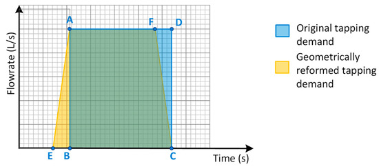 In order to make clearer the impact of the geometrical reforming in the correction of the estimated equivalent DHW volume, a qualitative example of the estimation derived from the original rectangular-shaped tapping demand and the corresponding estimation by the geometrical reforming are shown in Figure 10a,b, respectively.
