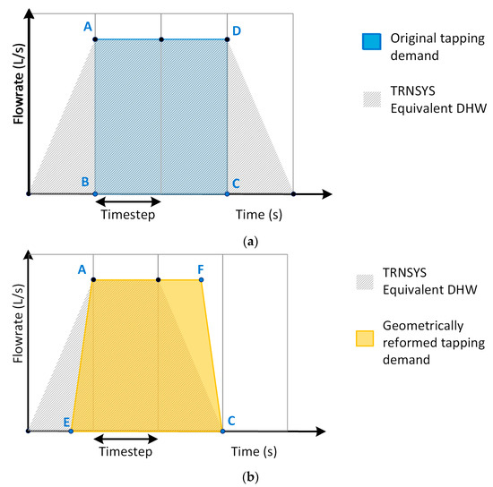 A qualitative example of an equivalent DHW calculation for a given timestep for (a) original tapping demand and (b) geometrically reformed tapping demand.