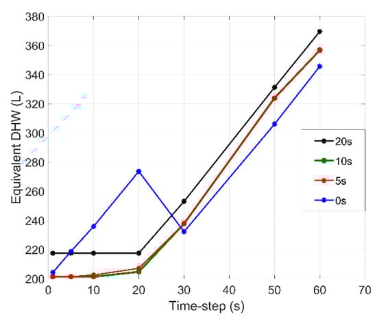 Based on the above, the time duration (EB) and the time step used in the DHW profile need to be determined to minimize the error with the trapezoid reforming. Hence, a dedicated sensitivity analysis was conducted. Four different (EB) duration values were evaluated, namely 0 s, 5 s, 10 s, and 20 s. By applying the four different durations under seven different time steps (1, 5, 10, 20, 30, 50, and 60 s), the results presented in Figure 11 were obtained. As can be seen in Figure 11, the optimal results were obtained for a time duration (EB) of 10 s, while for all the rest of the time durations, smaller time steps enhanced the calculation deviation. On the other hand, for time steps larger than 30 s, the smaller deviation was recorded for a time duration of 0 s (i.e., without reforming). However, this is attributed to the fact that an entire tapping use (at around 21:15) failed to be calculated. In order to prove this conclusion, the water draw profile of Table A3 was used as an input scenario for a timestep of 30 s and for EB = 0, as depicted in the dedicated run of Figure 12 (denoting with red the missed tapping). Regarding the time step for a specific time duration, time steps of equal or lower value than the time duration result in a constant result. On the contrary, for larger time steps, the result is unstable.