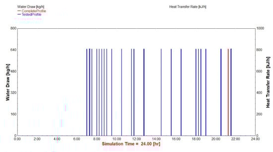 For the test rig’s case, under a constant flowrate of 0.18 L/s and with a temperature rise of 25 K, the equivalent liters of hot water, corresponding to an energy consumption of 5.845 kWh (Table A1), were equal to 200.4 L. In order to compare the model’s DHW profile area over a 24-h period with the aforementioned target volume, a quantity integrator (Type 24) connected with a scope (Type 76) was used.