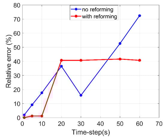 However, using the trapezoid reforming, the time period during which the demand is non-zero is larger than the time period (BC). In order to bypass this setback, the EA linear fraction is shifted parallelly until E==B. A second sensitivity analysis was conducted with the adapted trapezoid under the same time-step scenarios as in Figure 11. In this sensitivity analysis, the time duration EB was considered under four scenarios: 0 s, 1 s, 5 s, and 10 s. The control signal of the DHWP was multiplied by the pump’s constant flowrate, and the result was integrated over a single-day period. The results are depicted in Table 4. As shown, the accuracy of the results is heavily influenced by the time step and the use of the reforming, while it is not affected by the time duration (EB). This conclusion can be more easily visualized in Figure 13, where the relative error with and without the application of geometrical reforming is shown. Based on the above results, a value of 10 s was selected as the optimal time duration (EB), while the time step was selected to be 10 s as well, in order to minimize the computational time. These settings were applied in all the case studies presented in the next section.