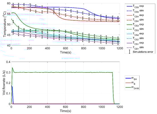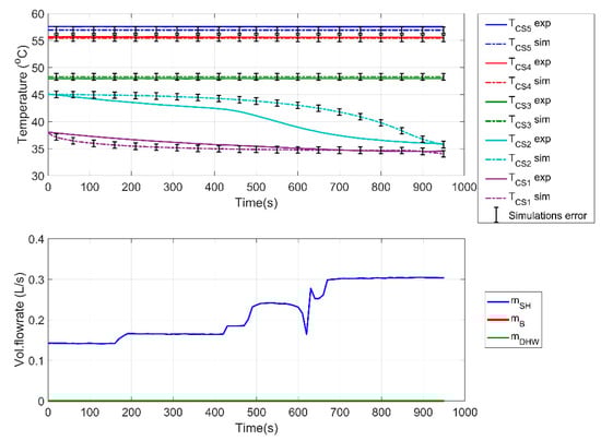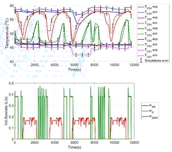 It is here noted that the error analysis of the experimental results is out of the scope of this study. The analysis regards the comparison of the simulated temperature levels with the values directly measured by the temperature sensors. Hence, the uncertainty of the experimental results is directly related to the accuracy of the temperature sensors reported in Section 2 and is not propagated through further calculations. As regards the measured water flow rate values, these are given as an input to the simulation model alongside the uncertainty of the respective sensors. With respect to the simulations, they were conducted with a relative convergence tolerance of 0.1% for all model variables.