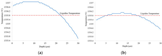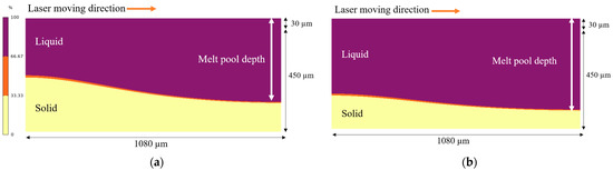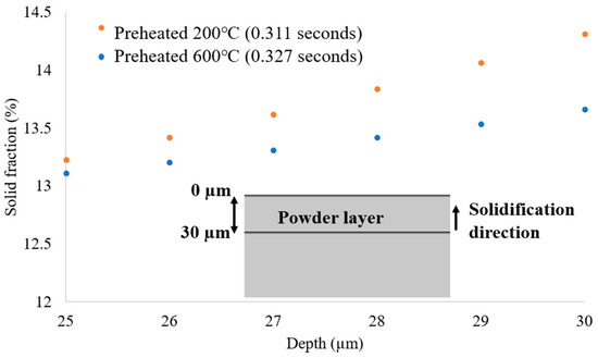 - The melt pool depth is greater in the preheating to 600 °C model than in the 200 °C model. Analysis of the solid percentage at the same points reveals that the model preheating to 200 °C undergoes a quicker transformation from liquid to solid compared to preheating to 600 °C.