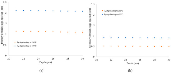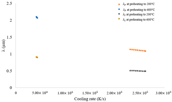 - Blocks built with preheating to 600 °C have a slower cooling rate and higher primary dendritic arm spacing (λ) than those preheated to 200 °C. This indicates a change in the microstructure by preheating to 600 °C.