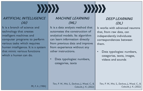 Deep learning (DL) can be regarded as a subsection of ML, as showed in Figure 1. While in ML, the algorithm is able to learn from input data, in DL methods, it is possible to identify correlations between data and their characteristics too, using neural networks capable of managing a great amount of data, even of different natures and of high dimensions. DL is based on ANNs too but can also work with advanced neurons and raw data. The types of input data are different between ML and DL techniques, since in DL images, videos and sounds can be handled too. Similarly to ML, supervised DL makes forecasting processes and unsupervised DL identifies the correlations among the data [45].