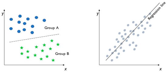 Supervised learning manages two types of problems, classification and regression, which are discussed below in (1) and (2). Their schemes are reported in Figure 3.