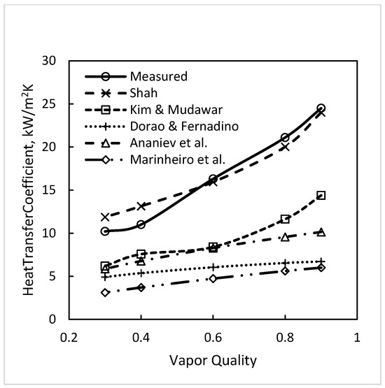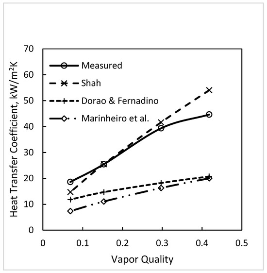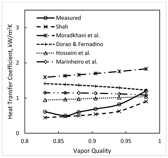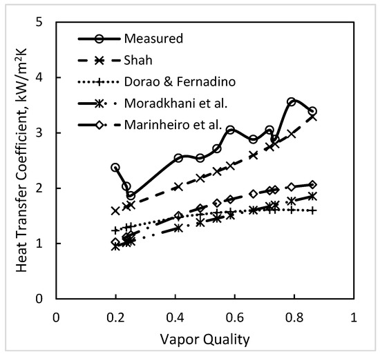It can be seen in Table 2 that for vertical flow, the Shah correlations have a MAD of 17.4%, while the deviations of all other correlations are much higher. The next best is Moradkhani et al., with a MAD of 27.2%. The correlations of Marinheiro et al. and Nie et al. have MADs of 29.6% and 131.5%, respectively. Only the Shah correlations distinguish between the horizontal and vertical channels. The phenomena in the two orientations are different because flows in the horizontal channels are asymmetrical at lower flow rates due to the effect of gravity, while the flow is symmetrical under vertical flow. Only the Shah correlations take these effects into account and are, therefore, able to predict heat transfer correctly. Other correlations do not take these into consideration and, therefore, fail to predict correctly. Figure 3 and Figure 4 show a comparison of some correlations with the data in the vertical tubes.