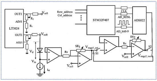 Figure 2 shows the overall structure of the acquisition circuit module. The circuit uses a single-channel multiplexing gating mode, employing the DG406 multiplexer chip as the analog switch. The diode units are gated by address signals, allowing precise control of the 48 × 48 array structure. A constant current source drives the temperature-sensitive diodes. Under constant current drive, the forward voltage drop VD of the diode has a linear relationship with temperature. This circuit structure is simple, has good anti-interference capability, and provides a stable output voltage. The LM334 three-terminal adjustable current source chip serves as the constant current source. Changing the value of the external resistor adjusts the constant current source output within the range of 1 μA to 10 mA. The positive voltage of the diode varies widely due to the different design parameters of the thermal test chip diodes and the size of the constant current source. The high-precision voltage regulator LT3024 provides the positive voltage Vref0 to match the diode output voltage with the amplifier input voltage range. The output voltage of the diode . Adjusting the value of the matching resistor (R2) changes the output value of the reference voltage Vref0. The output voltage range is adjustable from 1.2 V to 6.5 V, with a voltage source noise of 20 μVRMS.