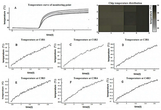 Temperature monitoring interface. (A) Temperature curve of test point and chip temperature distribution. (B) Temperature of CAR1 point. (C) C1R2 point. (D) C2R1 point. (E) C3R3 point. (F) C3R4 point. (G) C4R3 point.