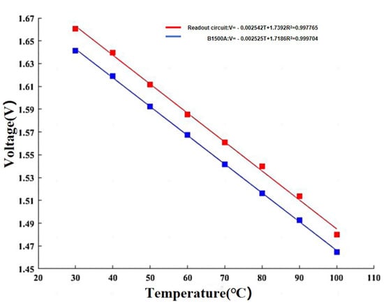 To verify system readout accuracy, the diode voltage at different temperatures was measured using both the Agilent B1500A semiconductor device analyzer and the designed multi-channel readout system. The temperature range was from 30 °C to 100 °C, with intervals of 10 °C. The data were processed and linearly fitted; the test results are shown in Figure 6. The fitted line for the multi-channel readout system was