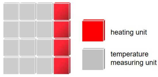 The thermal test chip used in the experiments consists of a 4 × 4 array of temperature-sensitive diode units, with each unit measuring 1 mm2 and offering a high thermal sensitivity of 2.6 mV/K. It is mounted on a 5 × 5 mm2 PCB test board using surface-mount technology. The chip’s design integrates heating resistors and sensing diodes, enabling simultaneous heating and temperature measurement capabilities. This setup facilitates precise thermal emulation for packaging and dissipation analysis. Figure 5 illustrates the chip structure, emphasizing the integration of functional elements for high accuracy and fast response times. The PCB test board measures 4.9 × 4.9 cm2, is 2 mm thick, and is connected via wire bonding. Figure 5 shows the thermal test chip and its structure, with basic performance parameters listed in Table 1.