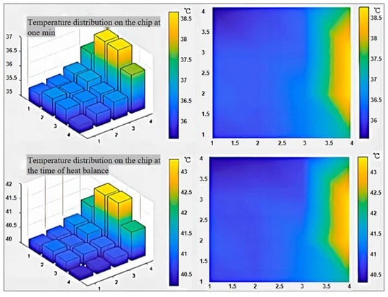 During steady-state temperature distribution testing, the heating unit’s position on the thermal test chip is shown in Figure 8, with a total power of 0.2 W. Temperature data were recorded after heating started, as detailed in Table 2. Based on the collected data, the temperature distribution on the chip was plotted in Figure 9. The experimental data indicate that the readout system can effectively distinguish temperature differences at various points within the thermal test chip, monitor temperature changes, and closely align with the theoretical model. Minor deviations observed in the measurements are likely caused by non-uniform heating across the chip and electrical noise in the data acquisition system. Future designs could mitigate these effects by improving thermal isolation and incorporating advanced filtering techniques in the acquisition circuit.
