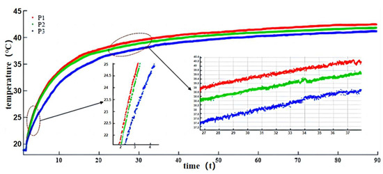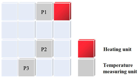 Transient thermal response testing was conducted on the thermal test chip using the same configuration as the steady-state temperature distribution testing. The heating unit’s position is shown in Figure 10, with a thermal power of 0.2 W. Temperature changes at points P1, P2, and P3 were recorded, as shown in Figure 11.