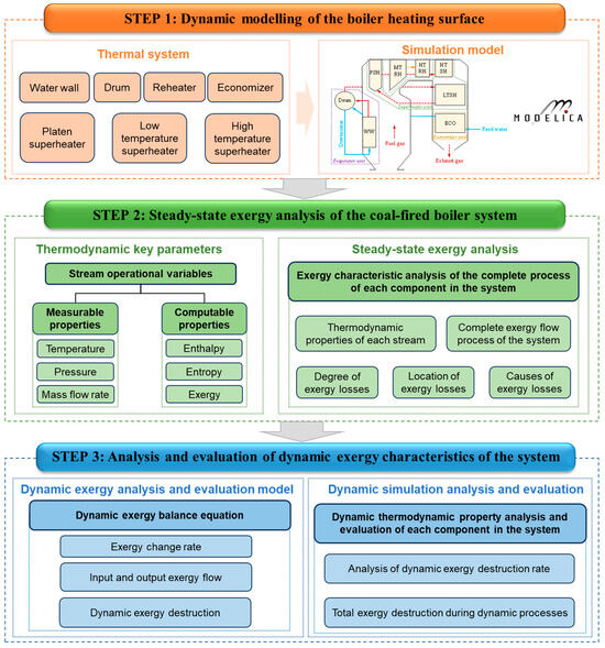 This study employs a systematic approach to evaluate the dynamic energy characteristics of heating surfaces in a 300 MW drum-type boiler, located in Ma’anshan City, Anhui Province, China. crucial for enhancing operational efficiency in coal-fired power plants. As depicted in Figure 2, the methodology is structured into three phases: First, a dynamic model of the boiler heating surfaces is developed using the Modelica/DYMOLA 2022 platform, incorporating key components, such as the water wall, drum, reheater, economizer, and superheaters. Second, a steady-state exergy analysis of the coal-fired boiler system is conducted to assess the thermodynamic properties and exergy losses across all components. Finally, an analysis and evaluation of the system’s dynamic exergy characteristics are performed, including dynamic exergy balance, exergy change rates, and exergy destruction, to provide insights into optimizing boiler performance under varying operational conditions.