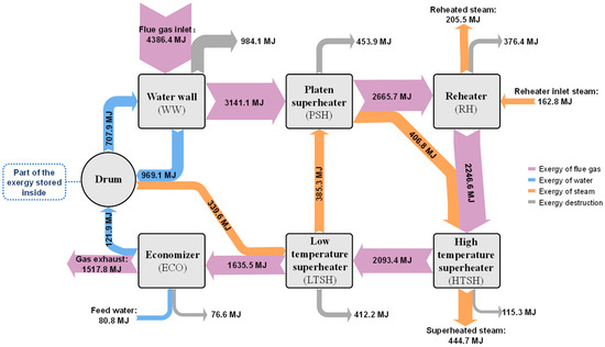 Exergy flow Sankey diagram of boiler heating surfaces.