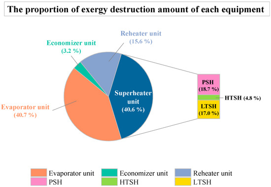 - During steady-state operation, the evaporator and superheater unit contribute to 81.3% of the total exergy destruction in the boiler heat networks. Notably, the water wall, platen superheater, and low-temperature superheater exhibit the highest proportions of irreversible loss within the boiler heat exchange networks.