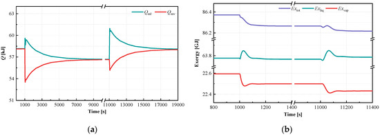 Figure 5 illustrates the response of heat transfer quantity and exergy between the wall and working fluid in the drum. The wall surface’s significant heat capacity and inertia contribute to a gradual temperature decrease and prolonged adjustment time. The dynamic process of heat transfer quantity under the two disturbance conditions persisted for over 5000 s. Consequently, there is also an observable phenomenon of delayed heat transfer between the wall and liquid or steam, as illustrated in Figure 5a.