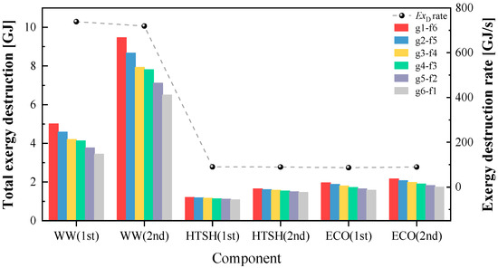 The exergy destruction rate and total exergy destruction for each component node in the dynamic process are displayed in Figure 6. The total exergy destruction for the three key heat exchange components decreases from a high-temperature flue gas inlet to the outlet. Notably, the heat transfer process between the flue gas inlet and the fluid outlet node (g1-w6) in the WW demonstrates the highest total dynamic exergy destruction of 9.5 GJ. This peak exergy destruction in the WW indicates its significant role in energy conversion and irreversibility within the boiler system, primarily due to the large temperature difference and phase change occurring in this component. Despite the WW components having the shortest dynamic process, the exergy destruction per unit time surpasses that of other components by 7.9–8.5 times, reaching up to 738.8 GJ/s. Consequently, the total exergy destruction under the two disturbance conditions in WW is significantly greater. As for the HTSH and the ECO, the exergy destruction rate per unit time under the two disturbances is comparable. However, due to differences in dynamic process duration, the total exergy destruction of the heat exchange nodes under the two disturbances in the ECO is slightly higher than that of the HTSH.