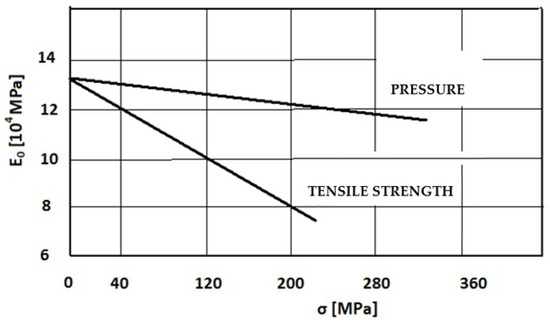 In terms of material breach (break and failure), tensile stress is dangerous; that is why the modulus of elasticity in tensile strength is more significant than in pressure. Both values decrease in GJS with an increase in tension [22], as shown in Figure 2.