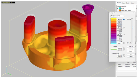 To ensure a long life, and especially to reduce the consumption of thermally stressed castings (parts), it is important to ensure their optimal structure, by which it is ensured a minimum formation of temperature differences and hence stresses. This is a rather complex problem for designers, which is now successfully solved by numerical simulation [24]. This modelling is provided in 2D and 3D, where products (castings) are often generated in complicated and difficult shapes to minimize thermal stresses that lead to damage and decapitation. Now a number of CAD systems (Computer-Aided Design) and FEA (Finite Element Analysis) and various universal systems are used for the purposes of simulation and modelling. The bases are highly sophisticated models of the approximation of physical quantities; usually, they enable the optimization of the design by a fairly complicated way that is possible when entering geometric, material, and limit data. The result is a graph of the temperature, stress, and deformation (strains) of a casting and other required parameters. Their correct identification by an accurate database is crucial, i.e., very specifically determined physical parameters, which are significantly changed with the chemical composition and the macro and microstructure of the material used. Inaccurate inputs lead to indirect results [25,26]. A graphic interpretation of temperatures in a particular casting (crane wheel) is shown in Figure 5. The simulation was created using NovaFlow&Solid CV 4.6r4 software [27].