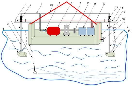 Oxygenation system with rotating fine-bubble generators: 1—fine-bubble generators (diameter: 0.1–0.5 mm); 2—pipeline (Ø15 mm); 3—anchor; 4—rod actuation mechanism; 5—mobile sealing; 6—air delivery pipe; 7—flow regulation valve; 8—tank (0.5 × 0.5 × 1.5 m); 9—compressor with profiled rotors (0.75 kW, 3000 rpm); 10—coupling; 11, 12—spark ignition engines; 13—sealing; 14—actuation mechanism; 15—support; 16—platform; 17—propeller; 18—pipeline; 19—fine-bubble generator; 20—solar collectors.