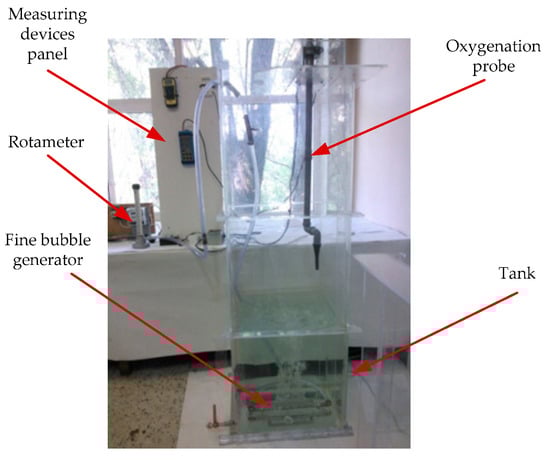 The experimental setup (Figure 2) consisted of a compressor for the production of compressed air. It was equipped with a manometer with a scale of 0–16 bar for displaying the pressure in the compressor tank and a pressure reducer for establishing the pressure in the installation pipes with a manometer of 0–12 bar as the working pressure in the installation. Compressed air pipes for the delivery of compressed air were made of plastic material, with an internal diameter of Ø15 mm and a wall thickness of 2 mm. They supplied the generator of fine bubbles with air and ensured the evacuation of the surplus air delivered by the compressor to the atmosphere and a series of valves and connecting elements of the pipes. The aeration tank was built from plexiglass plates with a thickness of 5 mm and dimensions of 0.5 × 0.5 × 1.5 (l × l × h). The fine-bubble generator consisted of elements connected to the compressed air pipe, the generator body, the air dispersion element in the water mass, and devices for measuring the pressure and temperature of the air flow.