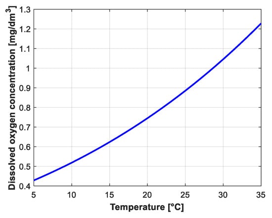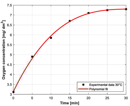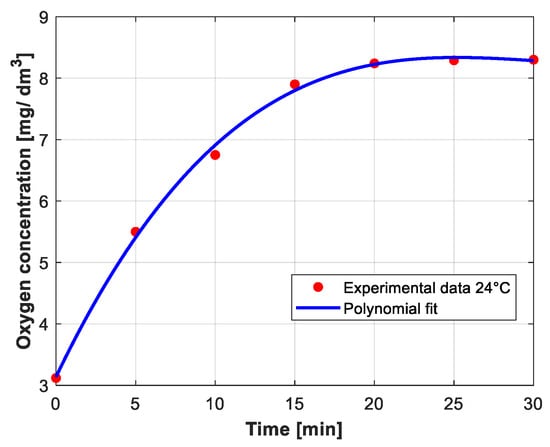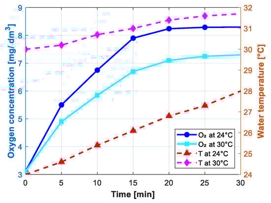 The initial concentration of dissolved oxygen in water was C0 = 3.12 mg/dm3. The saturation concentration at t = 24 °C was Cs = 8.3 mg/dm3 and at t = 30 °C was Cs = 7.3 mg/dm3. The volumetric mass transfer coefficient was considered: akL = 0.09 s−1 [43]. The experiments were conducted using tap water from the local network. The water had typical properties at room temperature, with an approximate density of 998 kg/m3 and electrical conductivity of around 500 µS/cm.