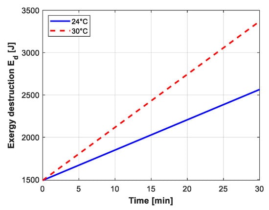 In terms of entropy generation, the 30 °C case exhibited a higher rate of irreversible processes, as shown in the model simulations. Entropy generation increased from approximately 5 J/K to 11.3 J/K over 30 min at 30 °C compared to 8.6 J/K at 24 °C. This corresponds to higher exergy destruction (3390 J at 30 °C vs. 2560 J at 24 °C), indicating lower thermodynamic efficiency.