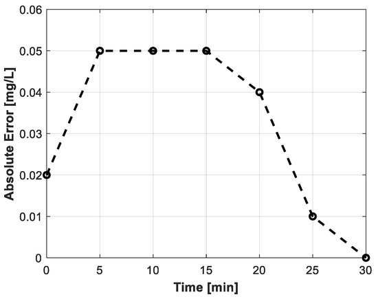 The error analysis (Figure 12) showed that the mathematical model maintains very good agreement with the experimental measurements. The absolute error remained below 0.1 mg/dm3 for most of the simulation time, with a maximum deviation of 0.15 mg/dm3 occurring at 10 min. This small deviation confirms the predictive reliability of the model under controlled conditions.