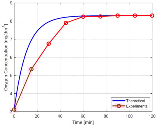 For the numerical evaluation comparing the theoretical and experimental results, the experimental data used are given Table 1, detailing dissolved oxygen concentration (C), pressure (p), volumetric flow rate (), and pressure differences (Δp) over a series of time steps. The aim was to compare the theoretically calculated oxygen concentration values at different times with the experimentally measured data.