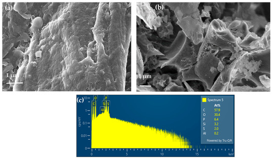 The morphological characteristic of the activated walnut shell was studied by SEM and EDS analysis. Figure 2a,b show SEM images of walnut shells before (a) and after (b) being activated with phosphoric acid. As can be seen, the non-activated carbon presents a non-porous structure, while the activated one (b) presents a rougher surface with cavities, showing a microporous structure. The EDS for this last sample (Figure 2c) also confirms the presence of phosphorus in the obtained material. It can also be observed that the sample is composed predominantly of carbon and oxygen. Phosphoric acid functions as an acidic catalyst, facilitating bond cleavage, hydrolysis, dehydration, and condensation processes. These reactions are accompanied by crosslinking between phosphoric acid and the biomass biopolymers, resulting in its integration into the material’s structure [38].
