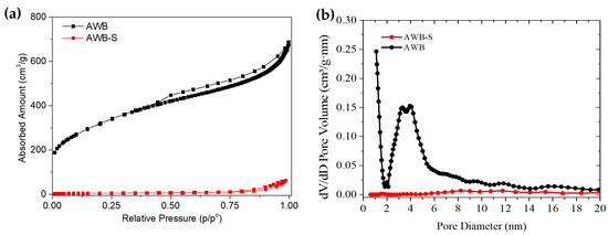 (a) N2 adsorption–desorption isotherms and (b) pore size distribution for AWB (black) and AWB-S (red).
